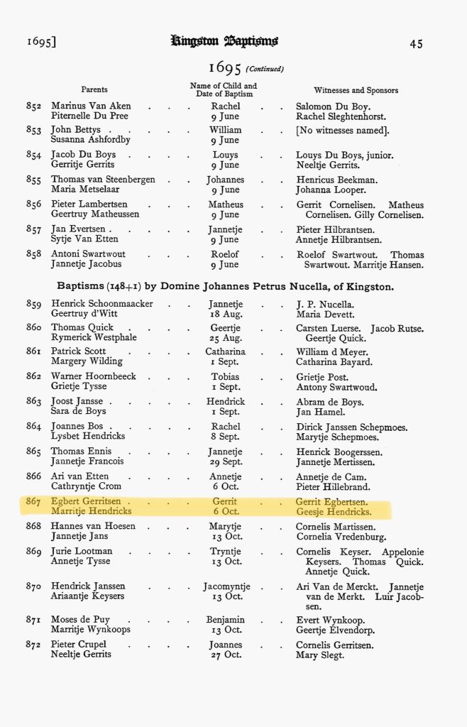 Now, is it possible that the late-1600s Gerrit Egbertsen in these Ulster County, New York, records is a different person than the mid-1600s Gerrit Egbertsen who sailed on The Spotted Cow? Or the ones who appeared in the New Amsterdam and Elizabeth Town records? Of course.